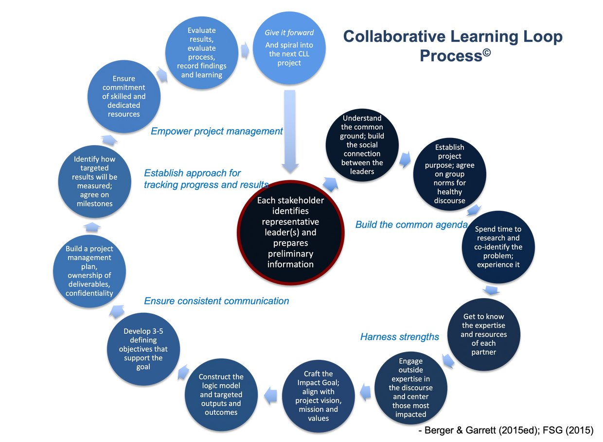 The CLL© Model is an approach to facilitate optimal partnership development is oriented around problem identification, knowledge sharing, project management, multi-stakeholder accountability and professional learning communities (PLCs). While PLCs have been largely constructed in academia, the basic premise centers on collaboration of all kinds that remove barriers and achieve clearly defined, targeted milestones and results (Dufour, 2004). The CLL is a powerful enabler in the process of designing for meaningful collective impact, wherein at least two sectors of society are coming together to solve a shared concern (Berger, 2013). In the CLL©, the partners are motivated to take advantage of each other's competencies, break down existing mental models, and build holistic solutions while also creating additional opportunities for further partnership, growth, and innovation. Kania (2014) / FSG (2015) shared five ingredients for a successful endeavor; these make up the backbone of the CLL©.